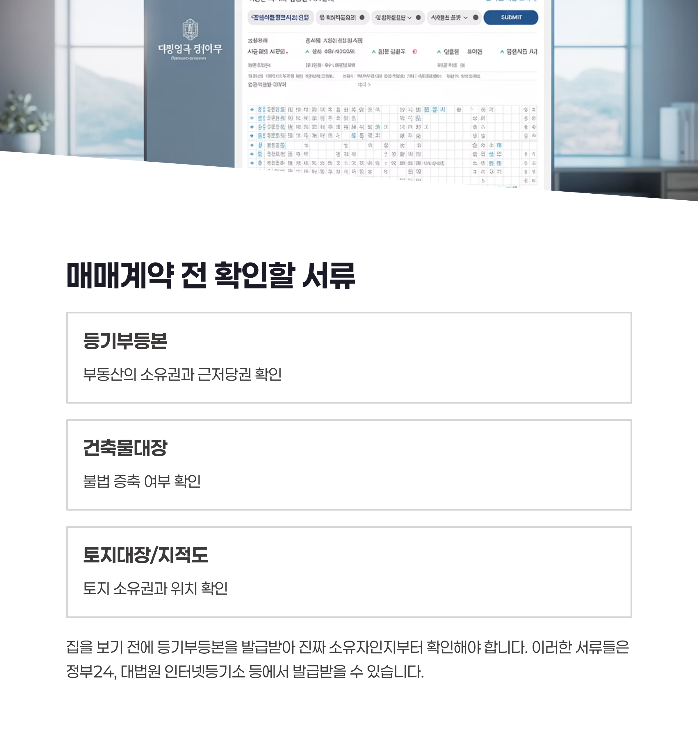 | 매물 확인 | 등기부등본, 건축물대장, 토지대장 |