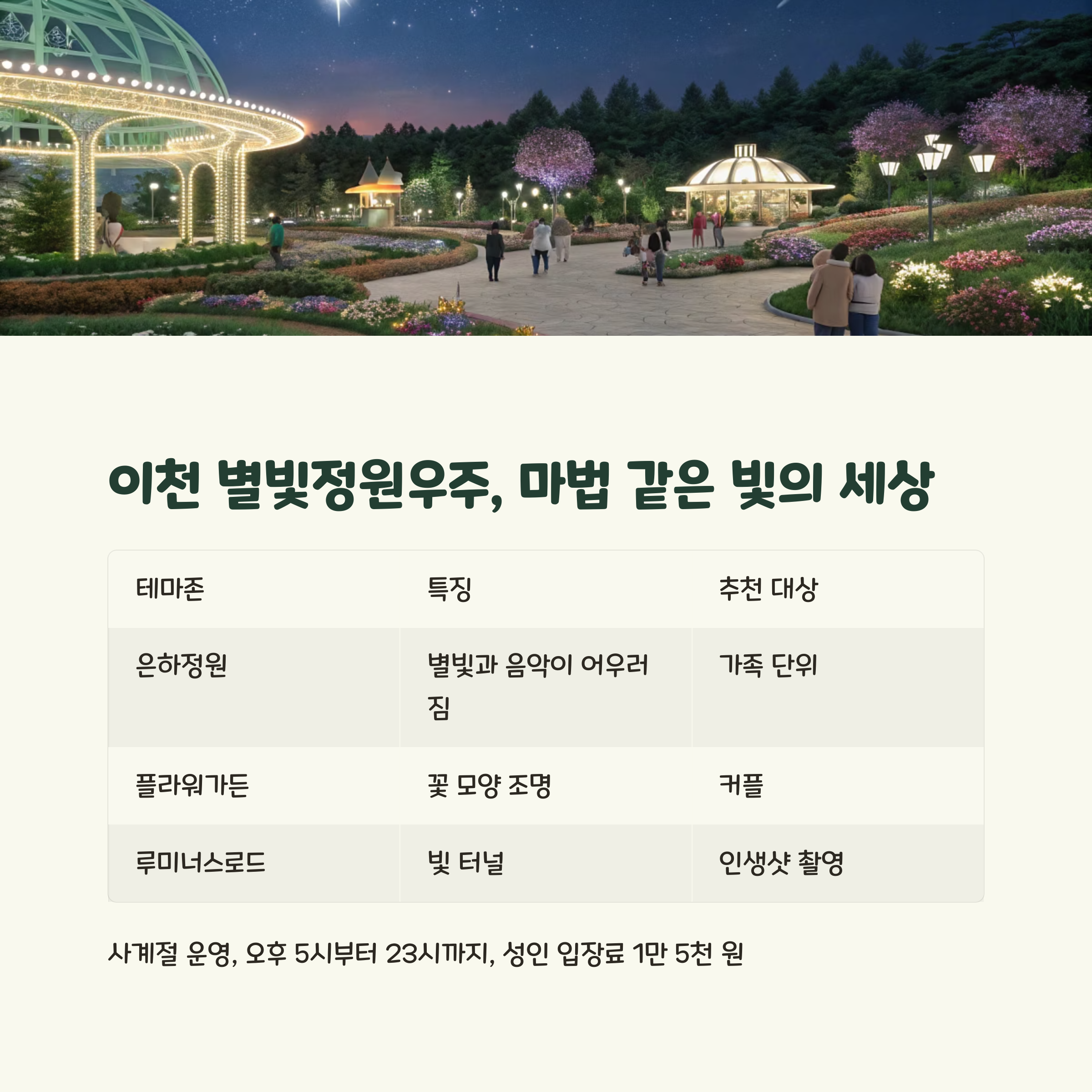 | 은하정원 | 별빛과 음악이 어우러짐 | 가족 단위 |