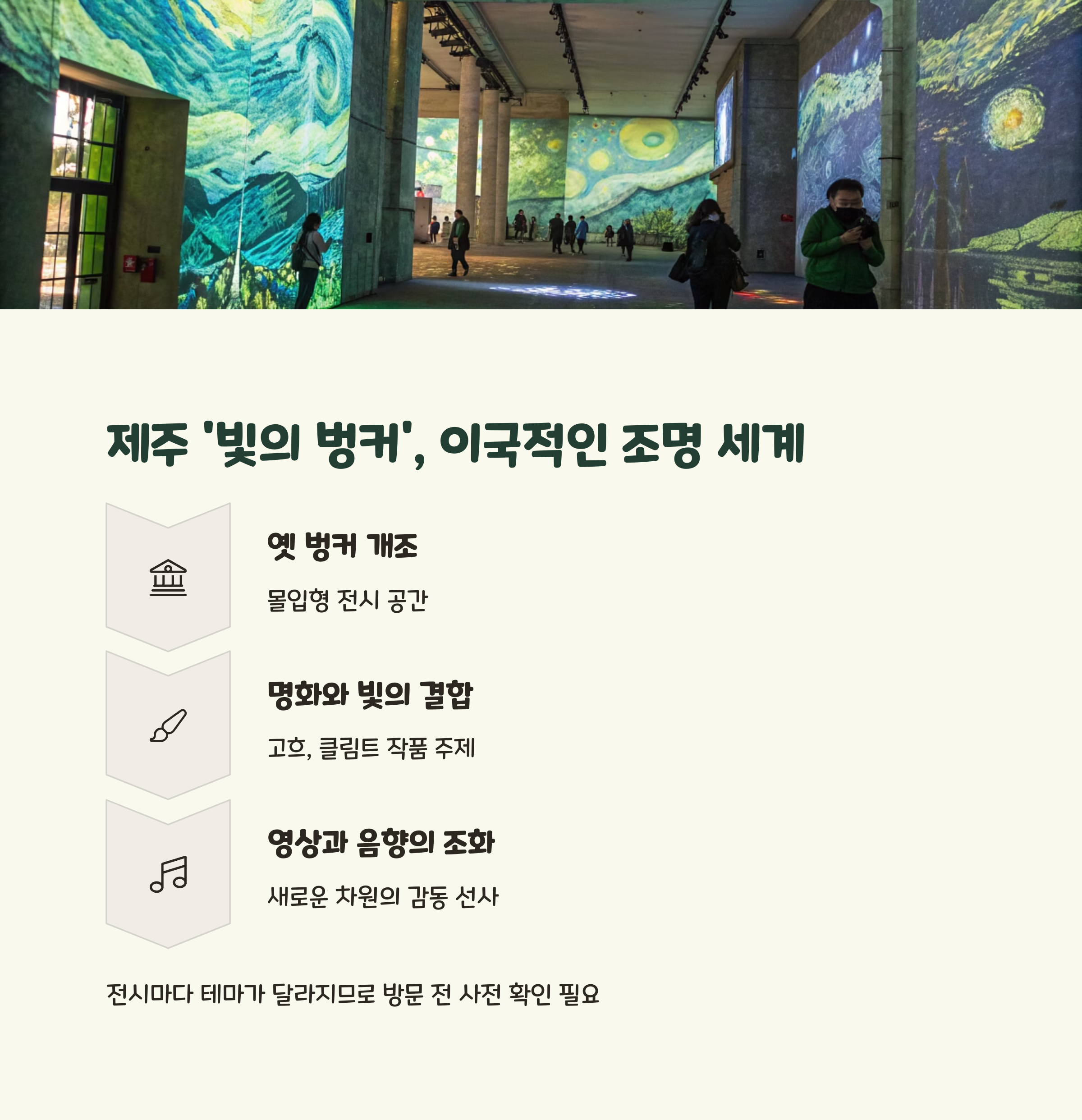 제주의 옛 벙커를 개조한 몰입형 전시 공간으로, 명화와 빛이 결합된 특별한 경험을 제공합니다.