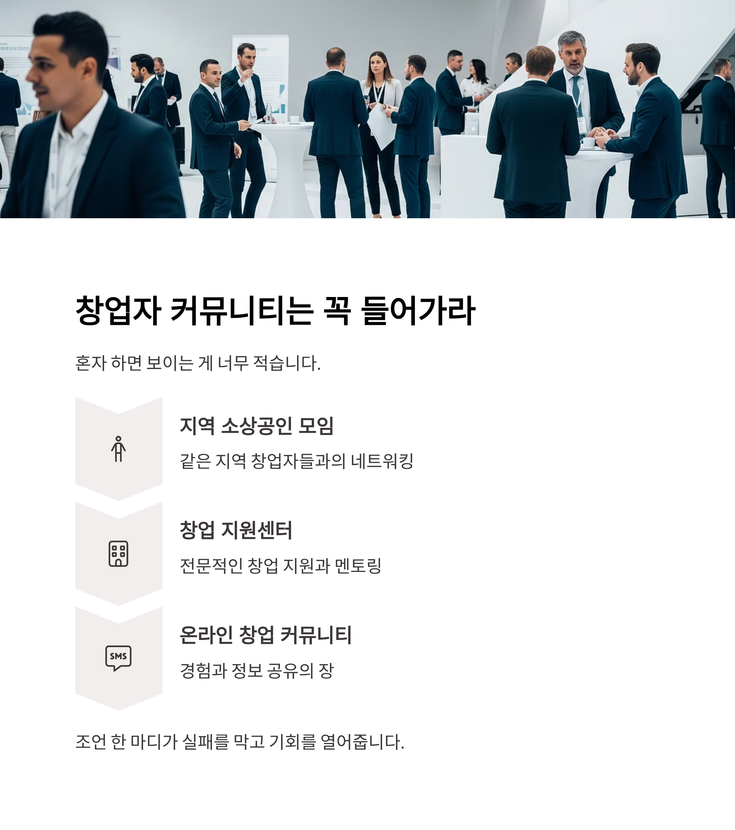 지역 소상공인 모임, 창업 지원센터, 온라인 창업 커뮤니티 등