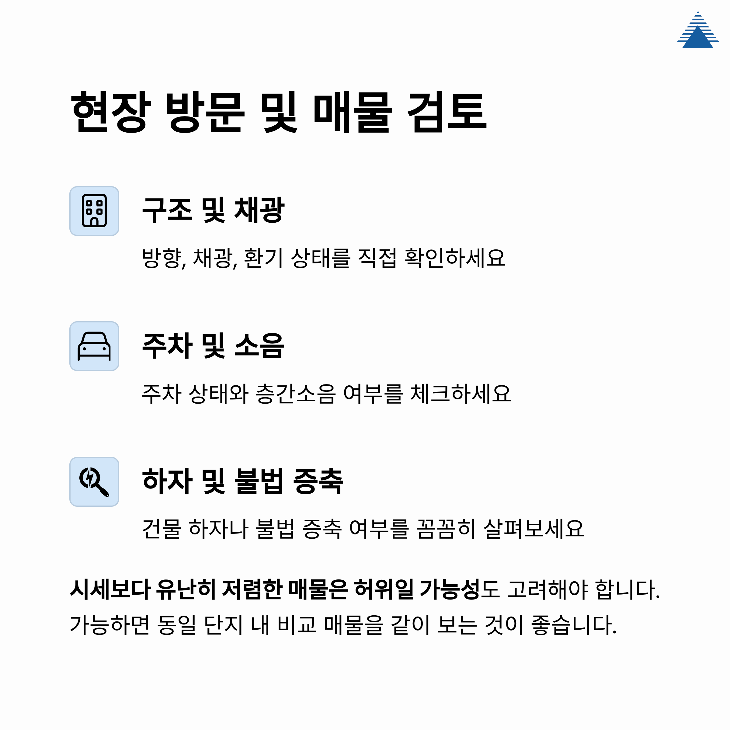 건물 하자나 불법 증축 여부도 꼼꼼히 살펴야 하며, 가능하면 동일 단지 내 비교 매물을 같이 보는 것이 좋습니다.