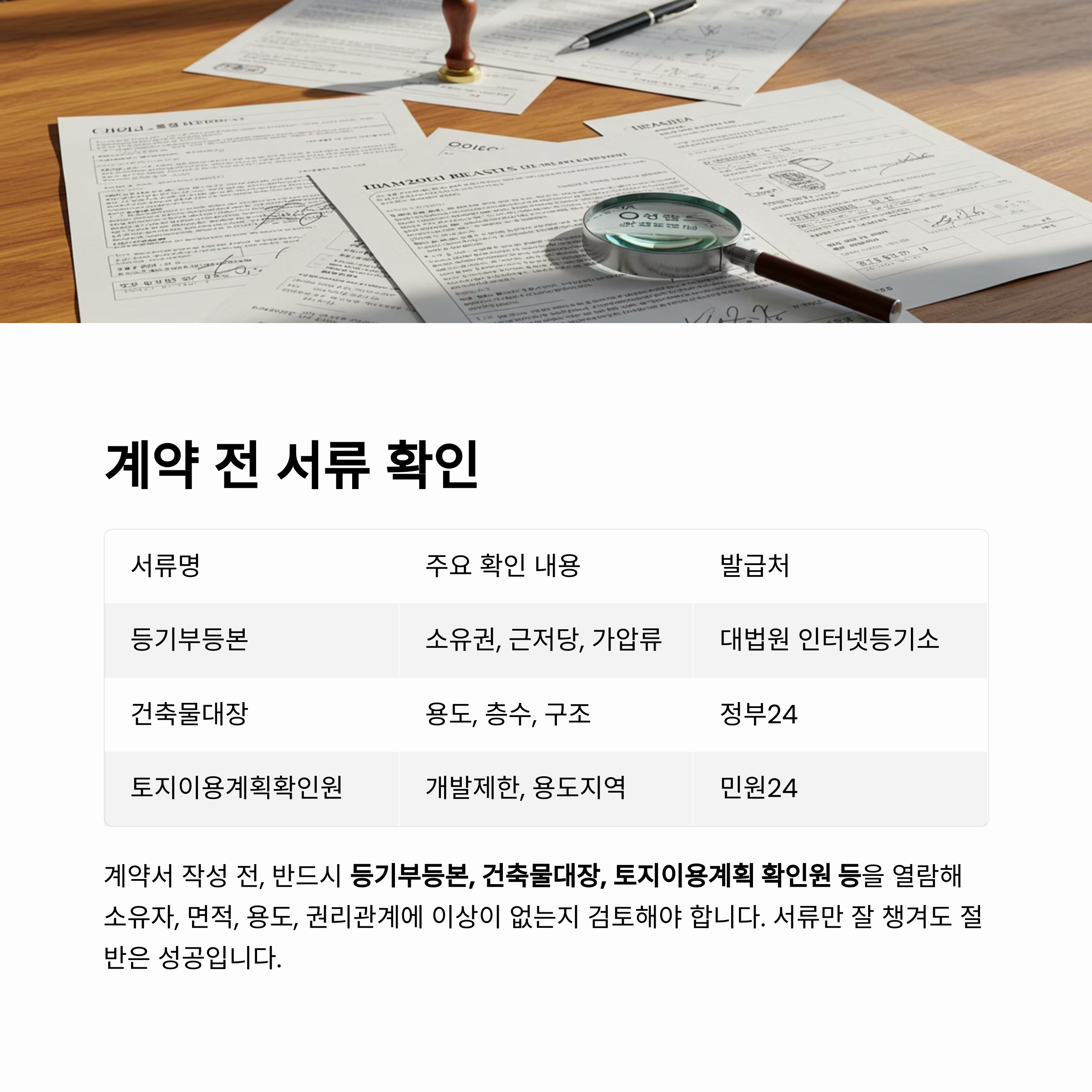 | 3단계 | 서류 확인 | 등기부등본, 건축물대장 |