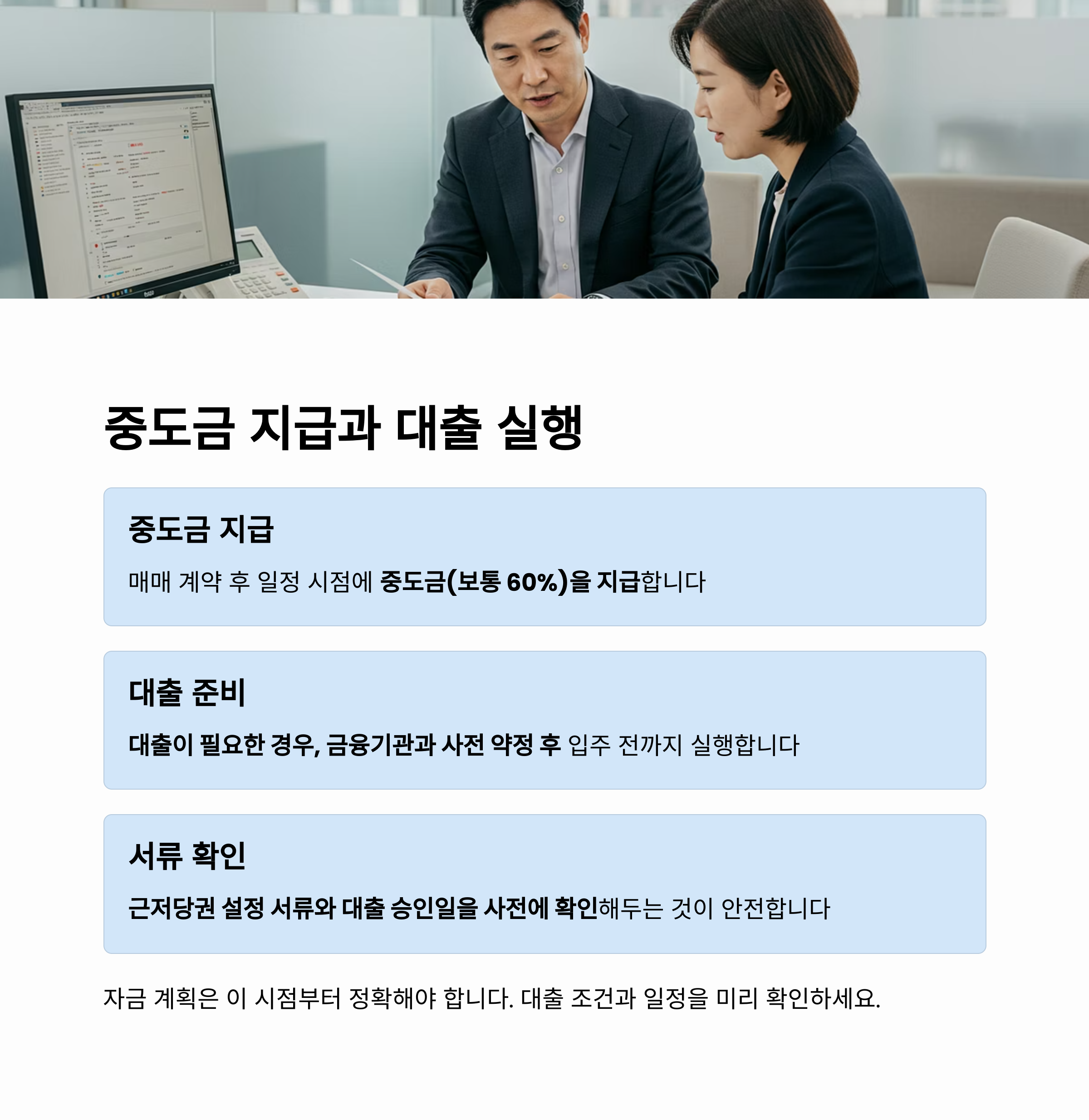 매매 계약 후 일정 시점에 중도금(보통 60%)을 지급합니다.
