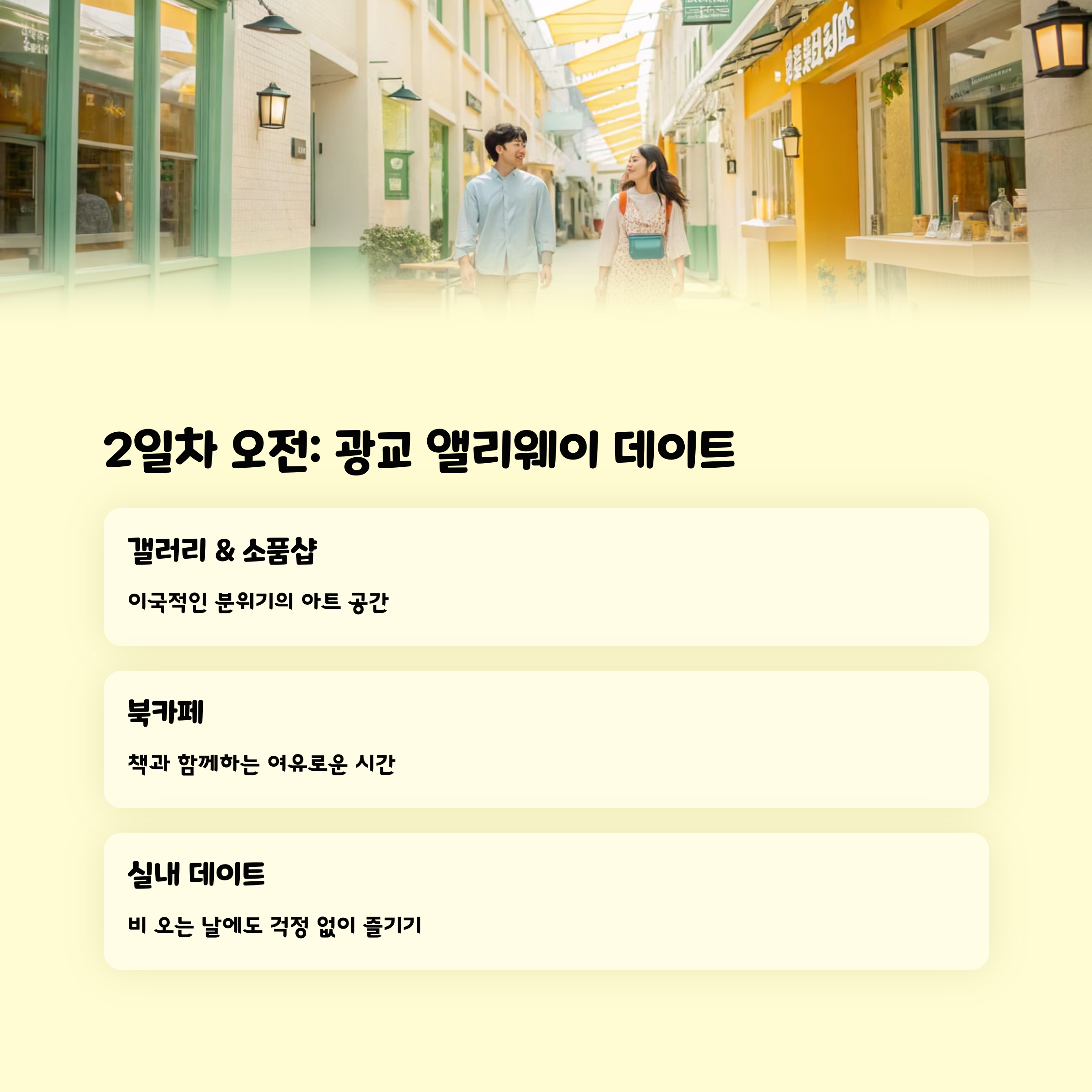 갤러리, 소품샵, 북카페 등 이국적인 분위기 속 여유로운 데이트가 가능하며