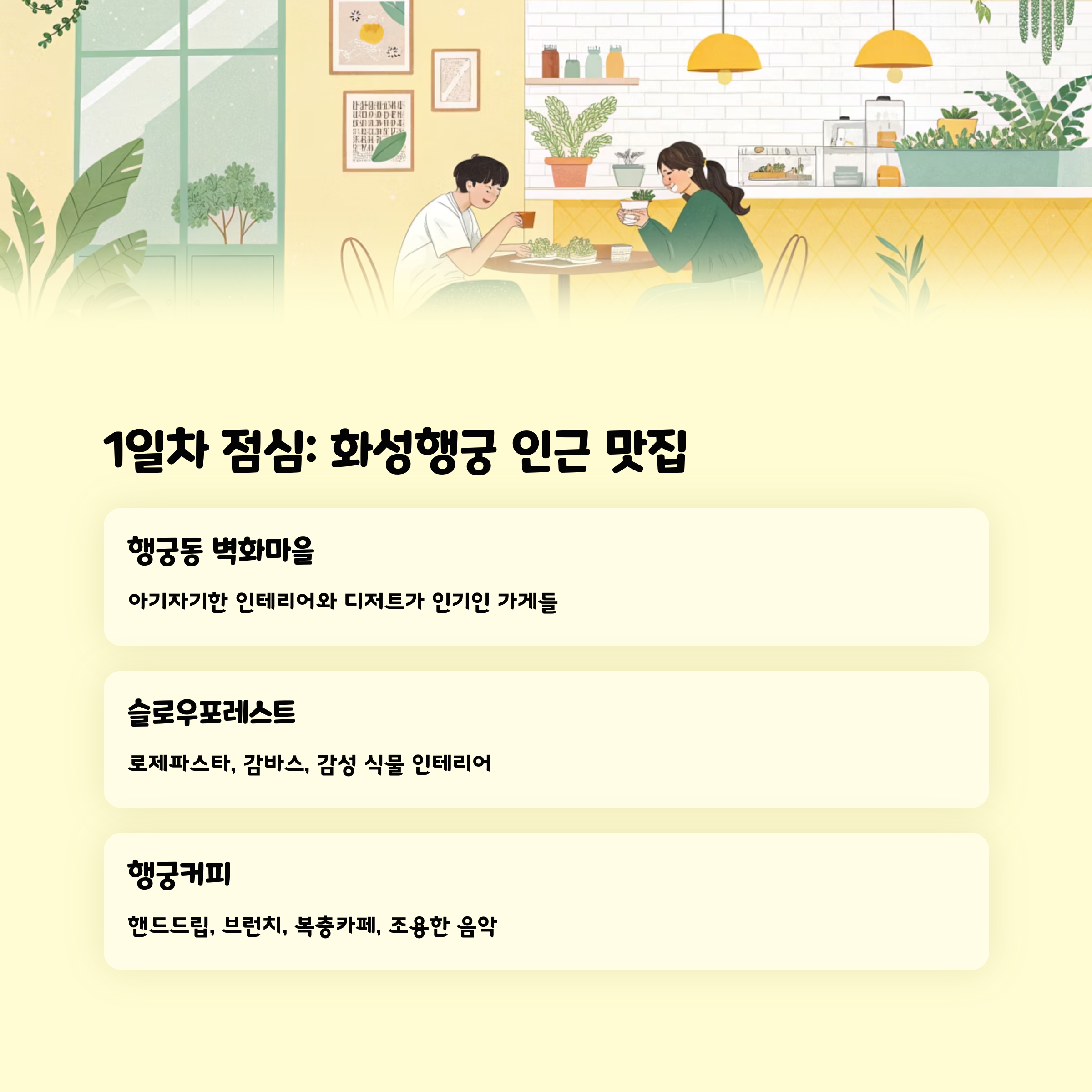 수원 화성 근처에는 분위기 좋은 감성 카페와 로컬 식당이 많습니다.