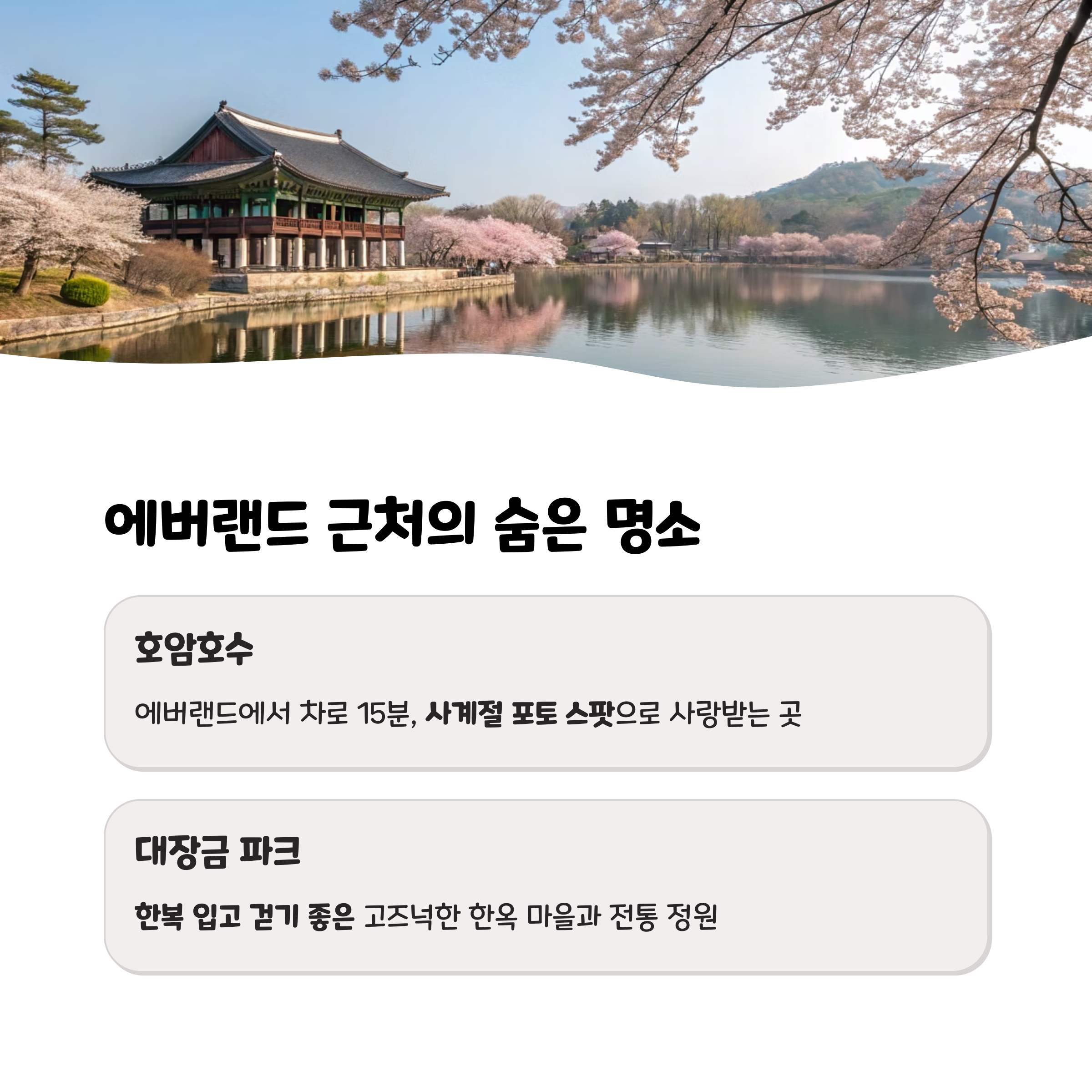 차로 15분 거리의 호암호수는 에버랜드 산책길의 연장선으로 여유를 더해주며,