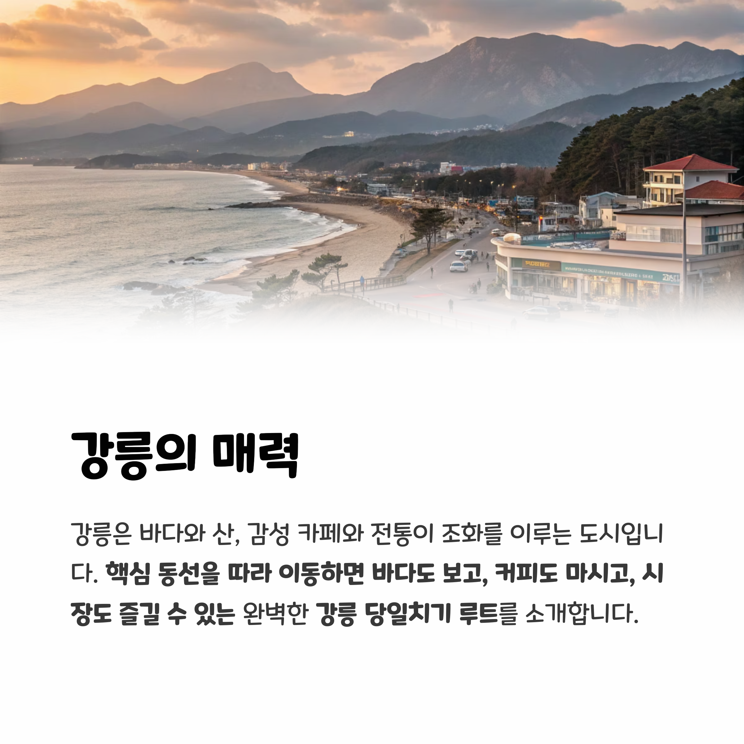 강릉은 바다와 산, 감성 카페와 전통이 조화를 이루는 도시입니다.