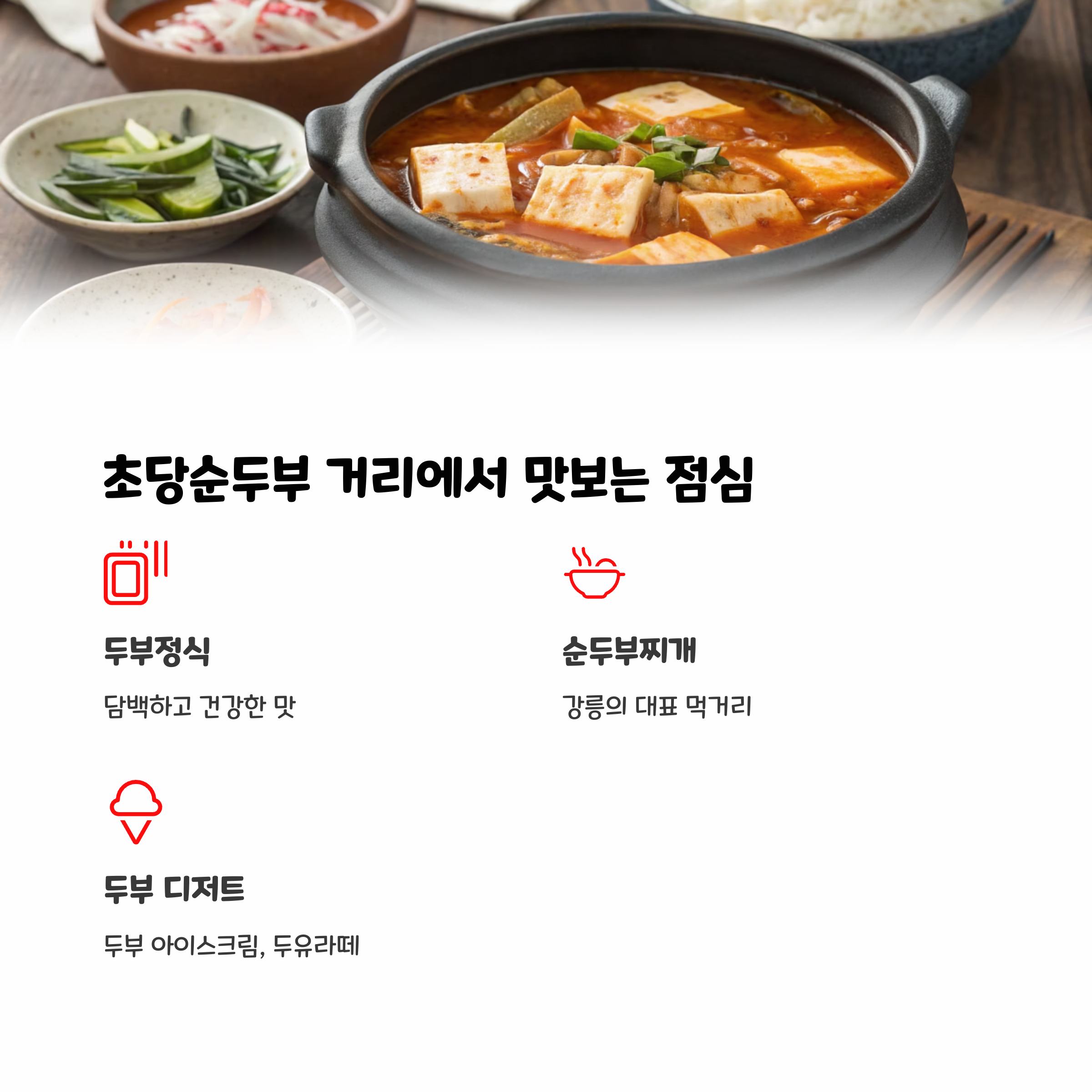 ‘초당옥’, ‘원조초당순두부’ 등 맛집이 많아 선택 폭도 넓습니다.