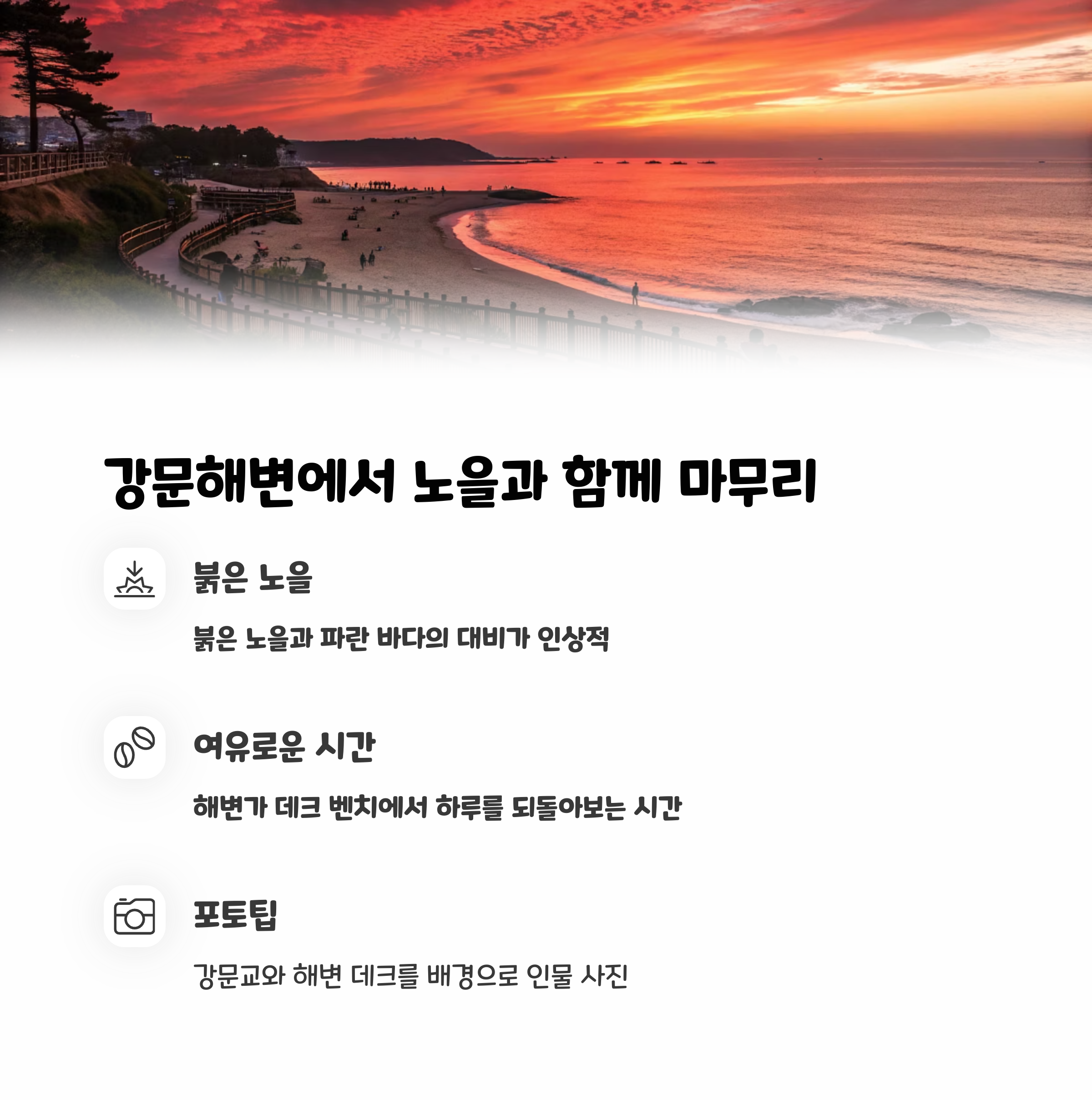 PM 17:00 – 강문해변 노을 감상으로 마무리