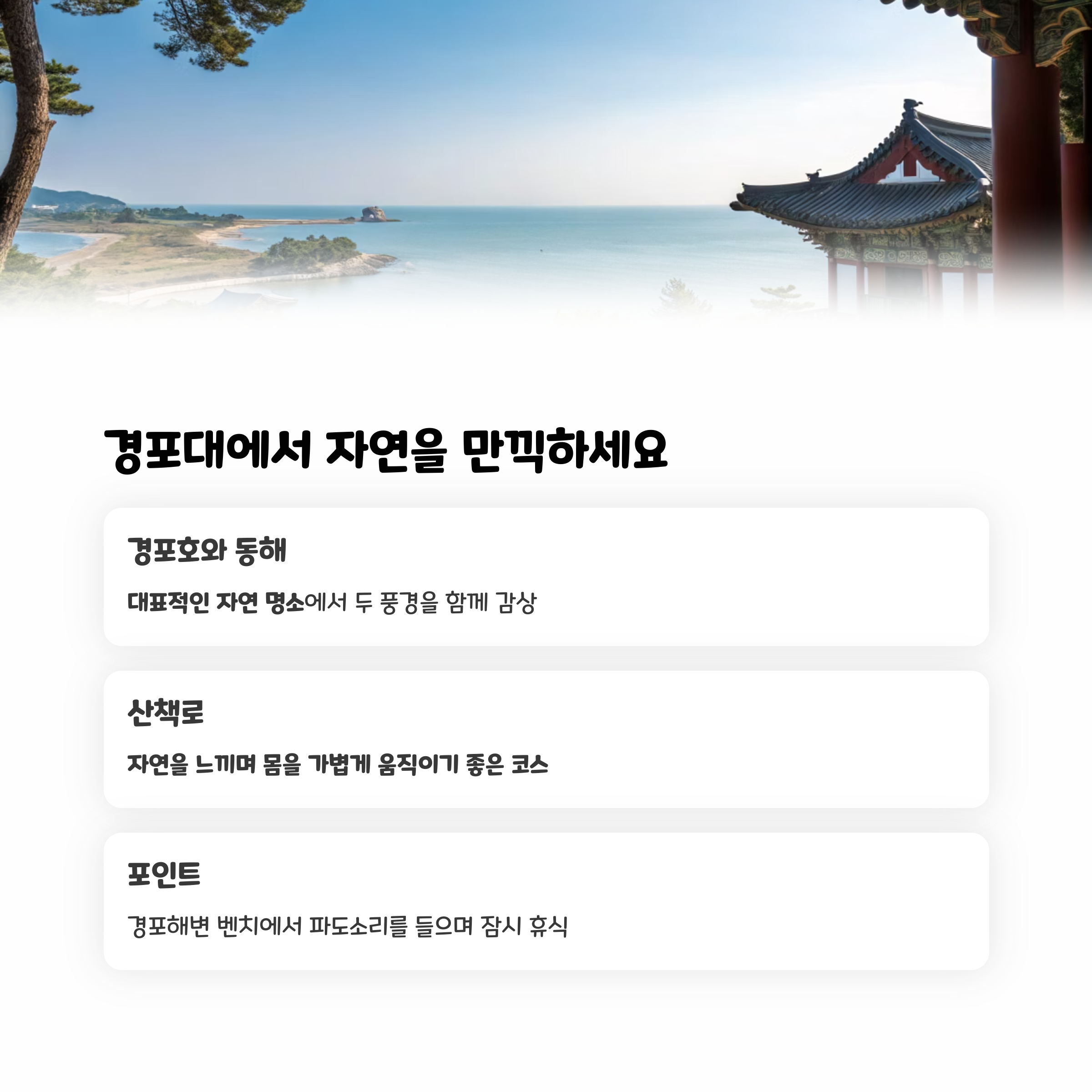 조선시대 누각 경포대와 호수 산책길, 해변 산책로까지 다양하게 연결되어 있어