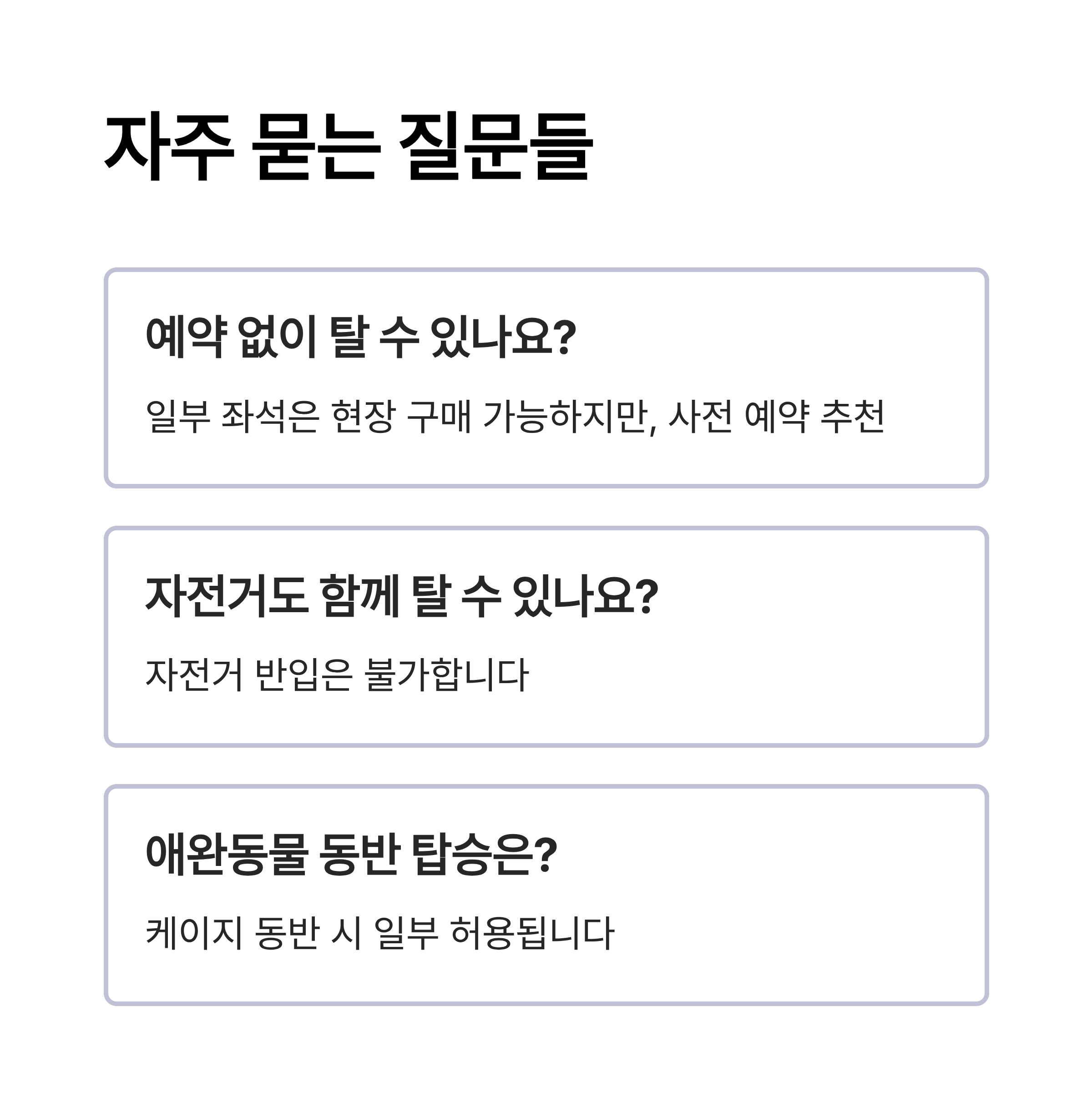 | 예약 없이 탈 수 있나요? | 일부 좌석은 현장 구매 가능하지만, 사전 예약 추천 |