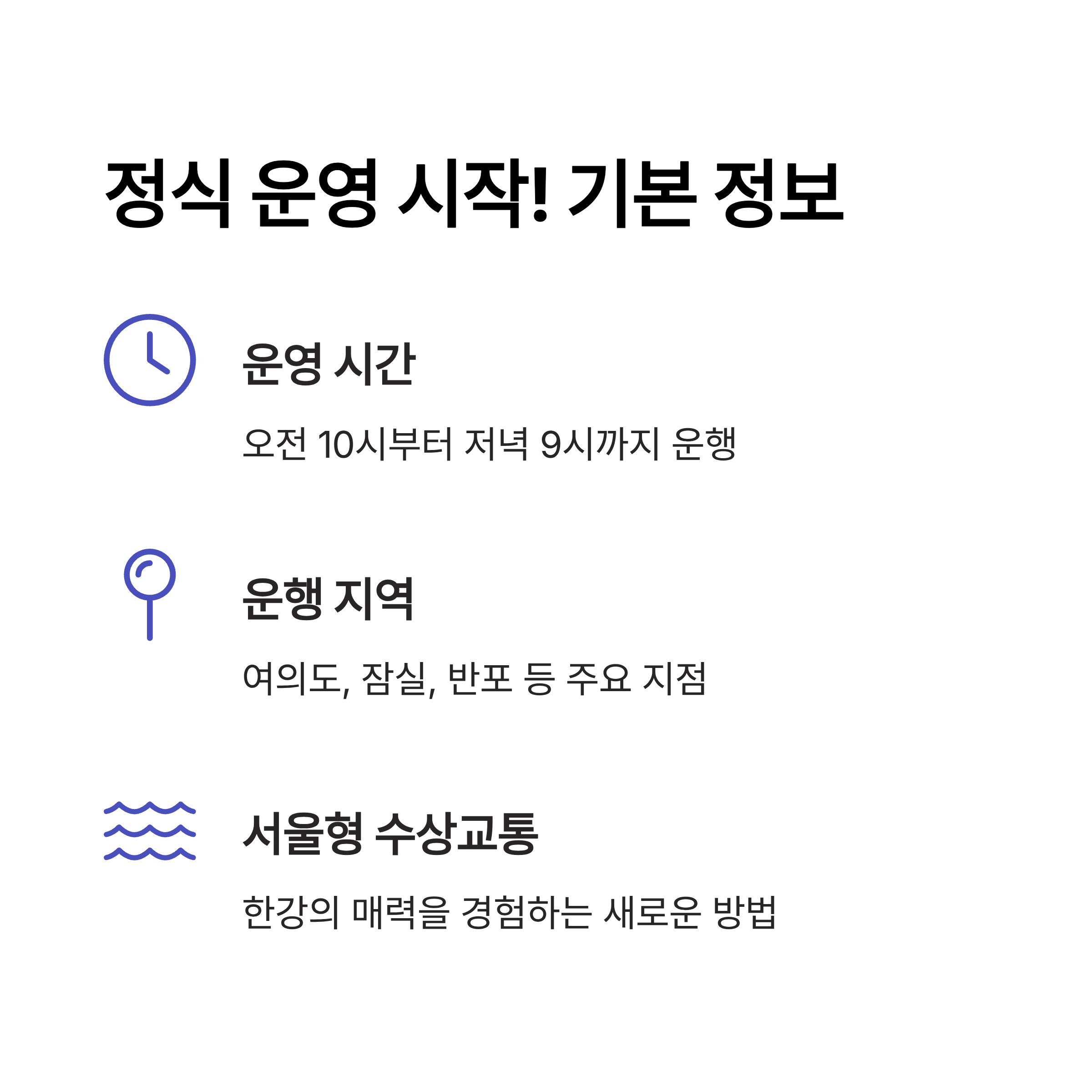 현재는 여의도, 잠실, 반포 등을 중심으로 운항 중이며, 테마형 노선으로 한강의 다양한 매력을 경험할 수 있죠.