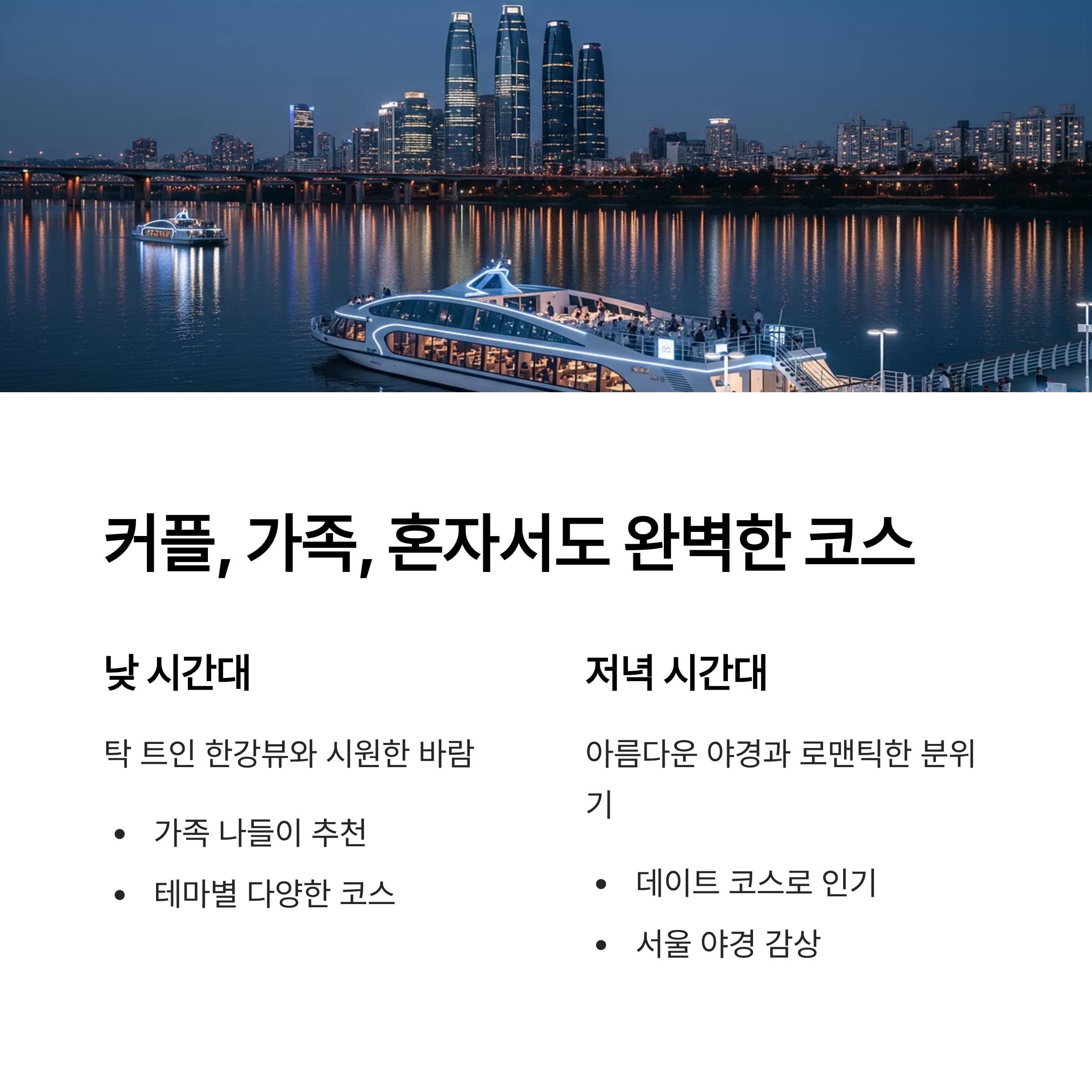 저녁 노선은 야경이 아름답기로 유명하고, 낮에는 탁 트인 한강뷰를 즐기기 좋아요.