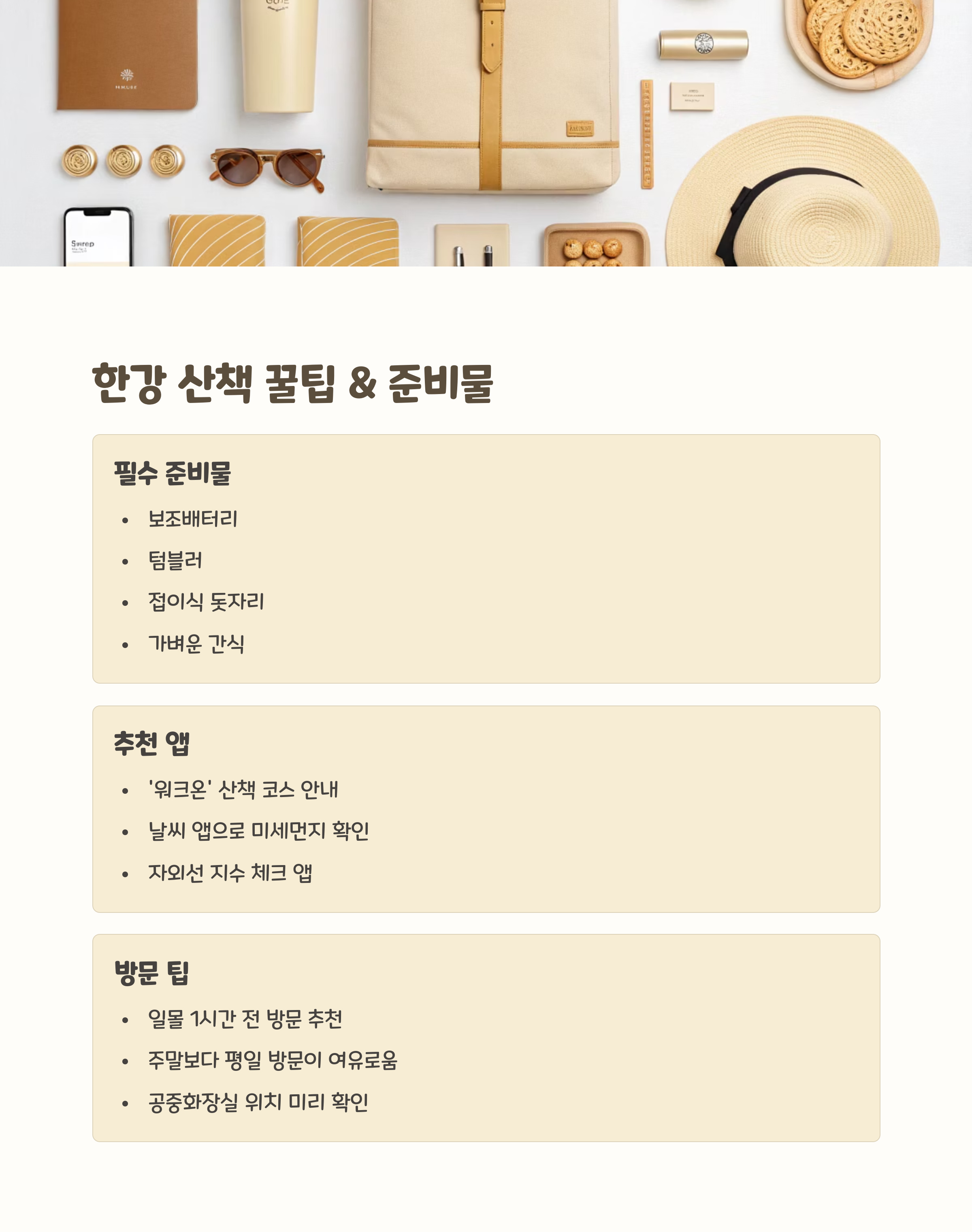 - 첫째, 날씨 체크는 필수예요. 강변은 바람이 예상보다 셀 수 있어요