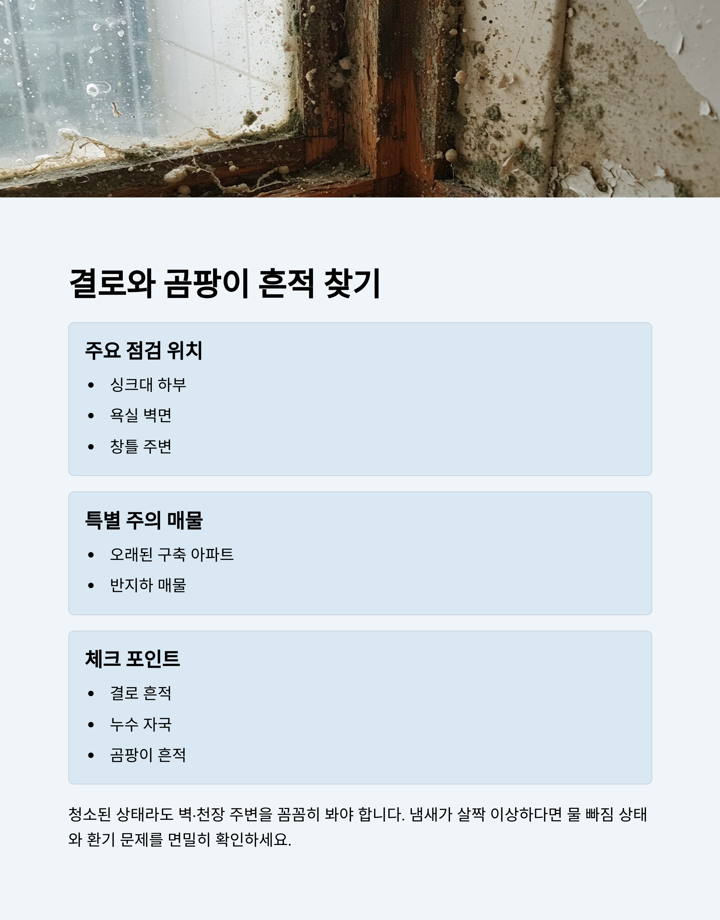 현장에서 흔히 놓치는 부분이 결로, 누수 자국, 곰팡이 흔적입니다.
