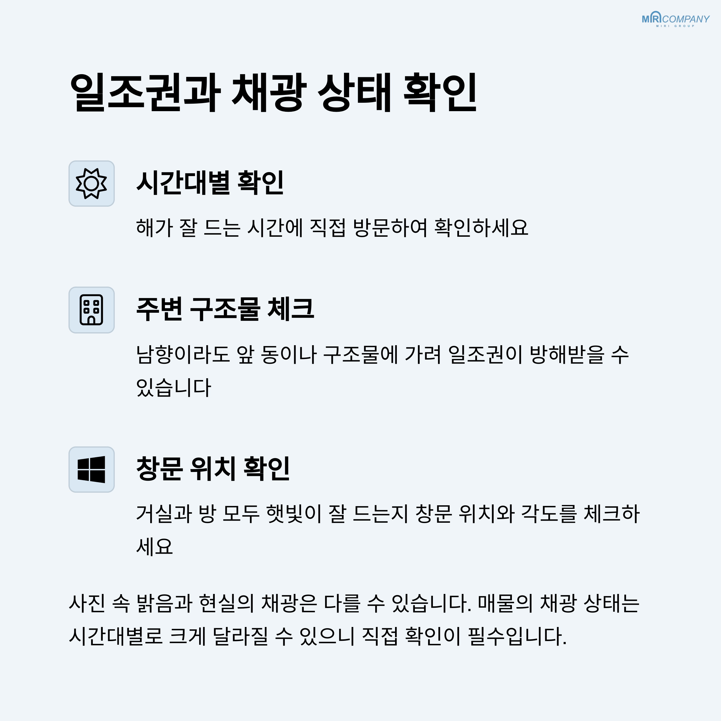 매물의 채광 상태는 시간대별로 다를 수 있기 때문에, 해가 잘 드는 시간에 직접 확인해야 합니다.